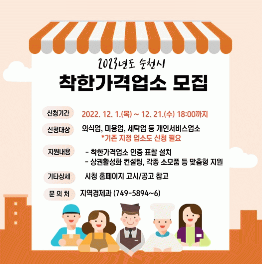 ½Åû´ë»ó ¾÷Á¾Àº ¼øÃµ½Ã¿¡¼ 6°³¿ù ÀÌ»ó ¿µ¾÷ ÁßÀÎ ¿Ü½Ä¾÷, ÀÌ¡¤¹Ì¿ë¾÷, ¼¼Å¹¾÷ µî °³Àμºñ½º¾÷Á¾ÀÌ´Ù. ½ÅûÀ» Èñ¸ÁÇÏ´Â ¾÷¼Ò´Â ½Åû¼¸¦ ÀÛ¼ºÇØ ¼øÃµ½Ã Áö¿ª°æÁ¦°ú·Î Á¦ÃâÇÏ¸é µÈ´Ù. ´Ù¸¸ ÇÁ·£Â÷ÀÌÁî ¾÷¼Ò, ÃÖ±Ù 1³â À̳» ÈÞ¾÷ÇÑ ¾÷¼Ò µîÀº ½Åû ´ë»ó¿¡¼ Á¦¿ÜµÈ´Ù.