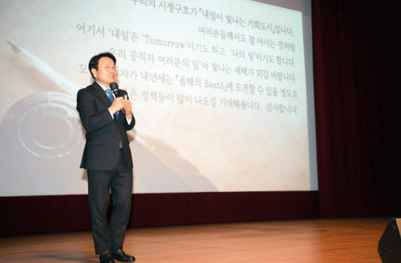 ³¡À¸·Î ° ½ÃÀåÀº ¡°¿ì¸®ÀÇ ½ÃÁ¤±¸È£´Â ¡®³»¡ÙÀÏÀÌ ºû³ª´Â ±âȸµµ½Ã¡¯·Î ¿©±â¼ ³»ÀÏÀº ´ÙÀ½³¯(tomorrow)À̱⵵ ÇÏ°í ¡®³ªÀÇ ÀÏ¡¯À̱⵵ ÇÏ´Ù¡±¸ç ¡°°øÁ÷ÀÚ ¿©·¯ºÐÀÇ ¡®ÀÏ¡¯ÀÌ ºû³ª´Â »õÇØ°¡ µÇ±æ ¹Ù¶õ´Ù¡±°í ¸»Çß´Ù.