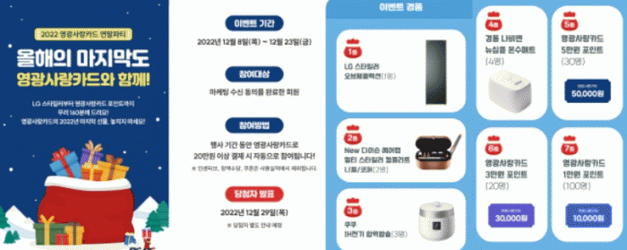 °æÇ°Àº 1µî LG½ºÅ¸ÀÏ·¯ ¿ÀºêÁ¦Ä÷º¼Ç 1¸í, 2µî ´ÙÀ̽¼ ¿¡¾î·¦ 2¸í, 3µî ÄíÄí ¾Ð·Â¹ä¼Ü 3¸í, 4µî ¿Â¼ö¸ÅÆ® 4¸í, 5µî ¿µ±¤»ç¶ûÄ«µå 5¸¸ ¿ø Æ÷ÀÎÆ® 30¸í, 6µî ¿µ±¤»ç¶ûÄ«µå 3¸¸ ¿ø Æ÷ÀÎÆ® 20¸í, 7µî ¿µ±¤»ç¶ûÄ«µå 1¸¸ ¿ø Æ÷ÀÎÆ® 100¸í µîÀ¸·Î ǪÁüÇÏ°Ô ÁغñµÆ´Ù.