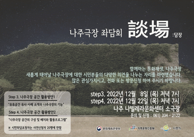 ³ªÁֽà °ü°èÀÚ´Â ¡°3~4Â÷ Á´ãȸ´Â ¿¾ ³ªÁÖ±ØÀåÀÇ ¼º°øÀûÀÎ ¹®ÈÀç»ý»ç¾÷À» À§ÇÑ µÎ Â÷·Ê ¿¸° ´ëȸ¦ ÅëÇØ ½Ã¹ÎµéÀÌ Á¦¾ÈÇÑ ÀǰßÀ» Åä´ë·Î ¿î¿µ °èȹ, Ȱ¿ë ¹æ¾È µîÀ» ³íÀÇÇÏ´Â ÀÚ¸®·Î ¸¶·ÃµÆ´Ù¡±¶ó¸ç ¡°¿¾ ³ªÁÖ±ØÀåÀÌ ¿ì¸® Áö¿ª Ư¼º¿¡ ¸Â°Ô ÁÖ¹ÎÀÌ ÇâÀ¯ÇÒ ¼ö ÀÖ´Â º¹ÇÕ¹®È°ø°£À¸·Î Á¶¼ºµÉ ¼ö ÀÖµµ·Ï ÃÖ¼±À» ´ÙÇϰڴ١±¶ó°í ¹àÇû´Ù.