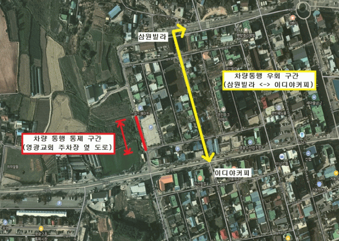 ÅëÁ¦±¸°£Àº ¿µ±¤±³È¸ ÁÖÂ÷Àå ¿· ¿Ü°ûµµ·ÎÀ̸ç, ÀÌ ±¸°£À» ÅëÇàÇÏ·Á´Â Â÷·®Àº ¿øÈ°ÇÑ ÅëÇàÀ» À§ÇØ »ï¿øºô¶ó ¡ À̵ð¾ßÄ¿ÇÇ ±¸°£ µµ·Î¸¦ ÀÌ¿ëÇÏ¿© ¿ìȸÇÏ¸é µÈ´Ù.