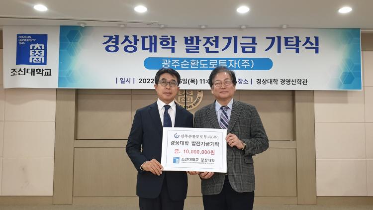 Á¶¼±´ëÇб³´Â Áö³ 15ÀÏ Á¶¼±´ë °æ»ó´ëÇÐ ¼¼¹Ì³ªA½Ç¿¡¼ ¿¸° ¡®°æ»ó´ëÇÐ ¹ßÀü±â±Ý ±âʽġ¯¿¡¼ ÀÌ¿µÈÆ<»çÁø ¿ÞÂÊ> ±¤±¤ÁÖ¼øÈ¯µµ·ÎÅõÀÚ(ÁÖ)¡¤±¤ÁÖ¼øÈ¯(ÁÖ) ´ëÇ¥À̻簡 1000¸¸¿øÀ» ÄèôÇß´Ù°í ¹àÇû´Ù.