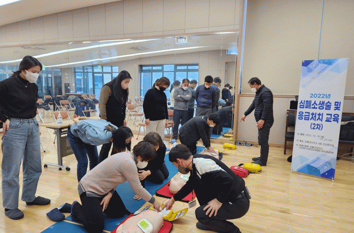 ±³À°¿¡ Âü¿©ÇÑ °øÁ÷ÀÚµéÀº Àü¹®°»çÀÇ Áöµµ·Î ÀÀ±Þ»óȲ ´ëó¿ä·É, ½ÉÆó¼Ò»ý¼ú(CPR), ÀÚµ¿½ÉÀåÃæ°Ý±â(AED) »ç¿ë¹æ¹ý µîÀ» ÀÍÈ÷°í ½ÇÀü ´ëÀÀ´É·ÂÀ» Ű¿ü´Ù.