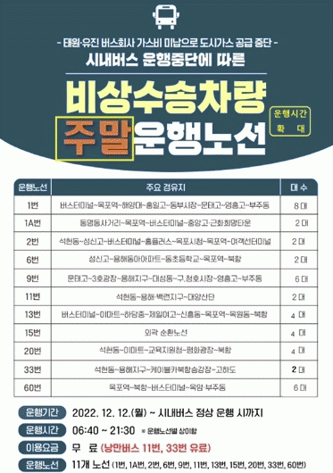 ¿îÇà³ë¼±Àº ÆòÀϰú µ¿ÀÏÇÑ 1¡¤1A¡¤2¡¤6¡¤9¡¤11¡¤13¡¤15¡¤20¡¤33¡¤60 µî ½Ã³» ÁÖ¿ä 11°³ ³ë¼±À̸ç, Àü¼¼¹ö½º 38´ë¿Í ³¶¸¸¹ö½º 4´ë µî ÃÑ 42´ë°¡ ¿îÇàµÈ´Ù.