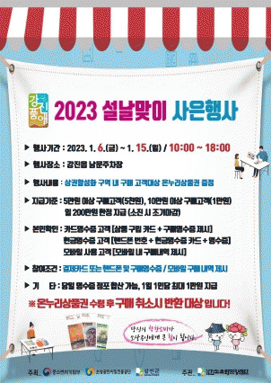 »çÀºÇà»ç´Â 2023³â 1¿ù 6ÀϺÎÅÍ 15ÀϱîÁö ÃÑ 10Àϰ£ °­ÁøÀ¾ ³²¹®ÁÖÂ÷Àå¿¡¼­ ÁøÇàµÇ¸ç »ó±ÇȰ¼ºÈ­ ±¸¿ª ³» »ó°¡¿¡¼­ ÀÏÁ¤ ±Ý¾× ÀÌ»ó ±¸¸ÅÇÑ °í°´¿¡°Ô ¿Â´©¸®»óǰ±ÇÀ» Áö±ÞÇÑ´Ù.
