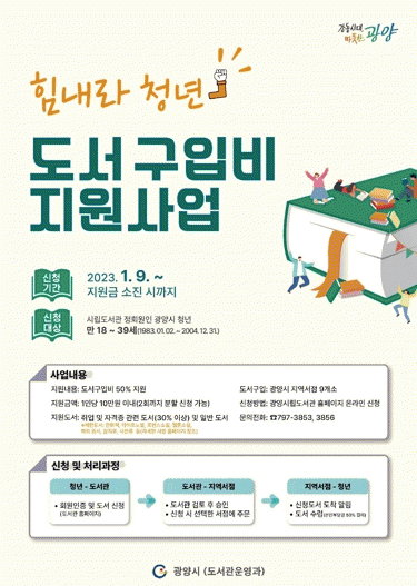 ±¤¾ç½Ã¸³µµ¼°ü¿¡ Á¤È¸¿øÀ¸·Î µî·ÏµÈ û³âÀÌ¸é ´©±¸³ª ½ÅûÇÒ ¼ö ÀÖÀ¸¸ç, û³â 1Àδç 10¸¸ ¿ø±îÁö(2ȸ ºÐÇÒ ½Åû °¡´É) Áö¿øÇϸç, º»ÀÎ ºÎ´ã±Ý(µµ¼ ±¸ÀÔºñÀÇ 50%)À» ÇÕÇϸé ÃÖ´ë 20¸¸ ¿ø±îÁö µµ¼¸¦ ±¸¸ÅÇÒ ¼ö ÀÖ´Ù.
