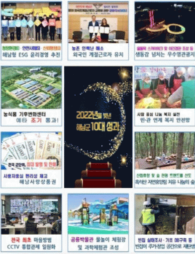10´ë¼º°ú´Â ÇØ³²Çü ESG À±¸®°æ¿µ ÃßÁø, Àü±¹ÃÖÃÊ ³ó¾÷ÀÎ ±â¼÷»ç °Ç¸³, ¿ì¼ö¿µ °ü±¤Áö Ȱ¼ºÈ, ±¹¸³ ³ó½Äǰ±âÈĺ¯È´ëÀÀ¼¾ÅÍ ¿¹Å¸ Á¶±âÅë°ú, ¹Î°ü¿¬°è º¹Áö¾ÈÀü¸Á ±¸Ãà, Àü±¹ ±º´ÜÀ§ ÃÖ´ë ÇØ³²»ç¶û»óǰ±Ç, Èæ¼®»ê ÀÚ¿¬È޾縲 ½£ÀÚ¿ø Ȱ¼ºÈ, Àü±¹ÃÖÃÊ ¸¶À»¹æ¹ü CCTV °üÁ¦ ÀÏ¿øÈ, °ø·æ¹Ú¹°°ü ÄÜÅÙÃ÷ È®Ãæ, ºóÁý Ȱ¿ë ÁÖ°Å, â¾÷°ø°£ Á¶¼º µîÀÌ´Ù.