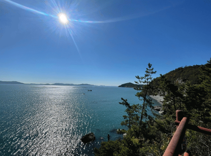 ¾à 4km ³Ñ´Â ¿Ï¸¸ÇÑ ÀÓµµ¸¦ Áö³ª »ï¹åÀç¿¡¼ 730m Á¤µµ ¿À¸£¸é »ó¿ÕºÀ(ÇØ¹ß 644m)¿¡ µµÂøÇϴµ¥, ÆÄ¶õ ¹Ù´Ù¿Í ¼¶ÀÌ ¸¸µç ´ÙµµÇØÀÇ ºñ°æÀ» º¼ ¼ö ÀÖ´Ù.