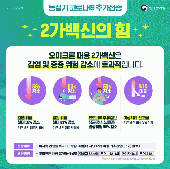 µ¿Àý±â 2°¡¹é½Å Ãß°¡Á¢Á¾Àº ¿À¹ÌÅ©·Ð º¯ÀÌ ´ëÀÀ 2°¡¹é½Å 4Á¾(¸ð´õ³ª BA.1 ±â¹Ý, ÈÀÌÀÚ BA.1 ±â¹Ý, ¸ð´õ³ª BA.4/5, ÈÀÌÀÚ BA.4/5 ±â¹Ý)ÀÌ È°¿ëµÇ¸ç, 12¼¼ ÀÌ»ó ½Ã¹Î Áß ±âÃÊÁ¢Á¾(1¡¤2Â÷)À» ¿Ï·áÇÑ »ç¶÷Àº ´©±¸³ª Á¢Á¾ °¡´ÉÇÏ´Ù.