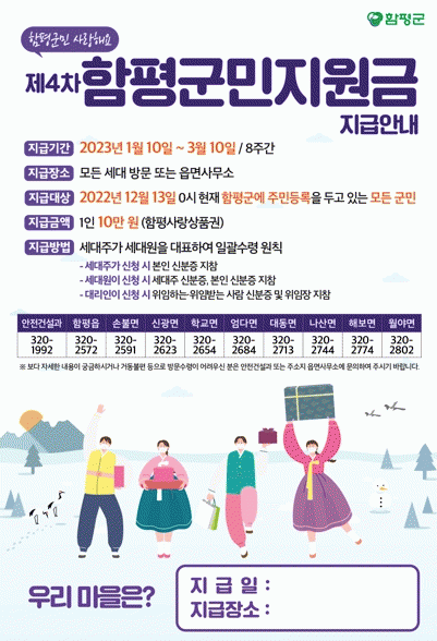 Áö±Þ´ë»óÀº 2022³â 12¿ù 13ÀÏ ±âÁØ ÇÔÆò±º¿¡ ÁÖ¼Ò¸¦ µÐ ±º¹ÎÀ̸ç, Áö±Þ±â°£Àº ³»³â 1¿ù 10ÀϺÎÅÍ 3¿ù 10ÀϱîÁö 8ÁÖ°£ÀÌ´Ù.