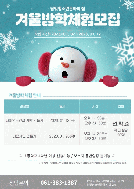ÃʵîÇб³ 4Çгâ ÀÌ»ó û¼Ò³âÀ» ´ë»óÀ¸·Î ÇÁ·Î±×·¥´ç °¢ 20¸í¾¿ ¸ðÁýÇϸç, Âü¿©´Â 1¿ù 12ÀϱîÁö ´©¸®Áý °øÁö»çÇ׿¡¼ üÇè ³»¿ëÀ» Âü°íÇØ ´ãºûû¼Ò³â¹®ÈÀÇÁý¿¡ Á÷Á¢ ¹æ¹®ÇØ ½ÅûÇÏ¸é µÈ´Ù.