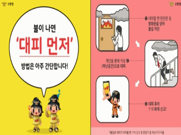 ÈÀç°¡ ¹ß»ýÇßÀ» ¶§´Â ½ÇÁ¦·Î ½Å¼ÓÇÑ ´ëÇǰ¡ Áß¿äÇÏ´Ù. »ýÁ¸À» À§ÇÏ¿© Á¥Àº ¼ö°Ç µîÀ¸·Î ÄÚ¿Í ÀÔÀ» ¸·°í ³·Àº ÀÚ¼¼·Î ¿Á»óÀ̳ª ¿ÜºÎ·Î À绡¸® ´ëÇÇÇØ¾ß ÇÑ´Ù.