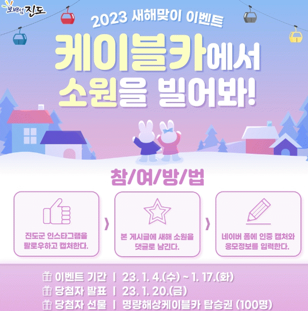 Áøµµ±º °ø½Ä ÀνºÅ¸±×·¥ÀÇ À̺¥Æ® °Ô½Ã±Û¿¡ 2023³â »õÇØ ¼Ò¿øÀ» ´ñ±Û·Î ³²±â°í, °Ô½Ã±ÛÀÇ ÁÁ¾Æ¿ä, Áøµµ±º ÀνºÅ¸±×·¥ ÆÈ·Î¿ì ½Åû, Ä£±¸¼Òȯ±îÁö ¿Ï·áÇÑ Âü°¡ÀÚ¿¡°Ô ¸í·®ÇØ»óÄÉÀ̺íÄ« ž½Â ±³È¯±ÇÀ» Á¦°øÇÑ´Ù.
