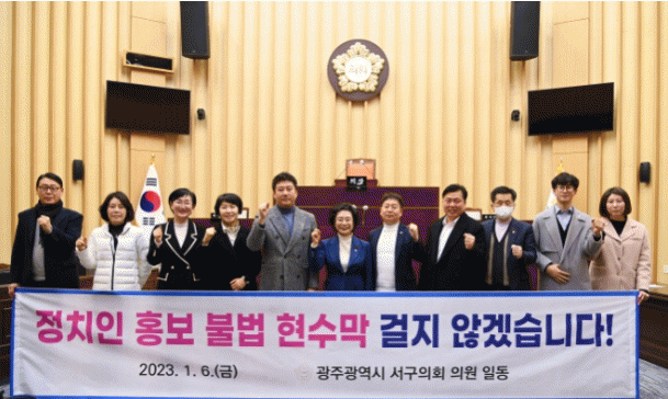 Áö³ 6ÀÏ ±¤ÁÖ ¼±¸ÀÇȸ ÀÇ¿øµéÀº¡®Á¤Ä¡ÀÎ È«º¸ ºÒ¹ýÇö¼ö¸· °Ôø ±ÝÁö¡¯Á¦¸ñÀÇ Ä·ÆäÀÎÀ» ÁøÇàÇϸç Çö¼ö¸· ¼³Ä¡ ±ÙÀý¿¡ ³ª¼¹´Ù.