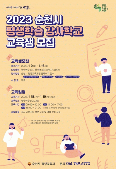 ±³À°Àº ¿À´Â 18ÀϺÎÅÍ ÀÌÆ²°£ ¼øÃµ½Ã ¹®È°Ç°¼¾ÅÍ Æò»ýÇнÀ°ü¿¡¼ ÁøÇàµÇ¸ç, ¿ÀÀü¡¤¿ÀÈÄ¡¤¾ß°£¹Ý Áß ¼±ÅÃÇØ ¼ö°ÇÒ ¼ö ÀÖ´Ù.
