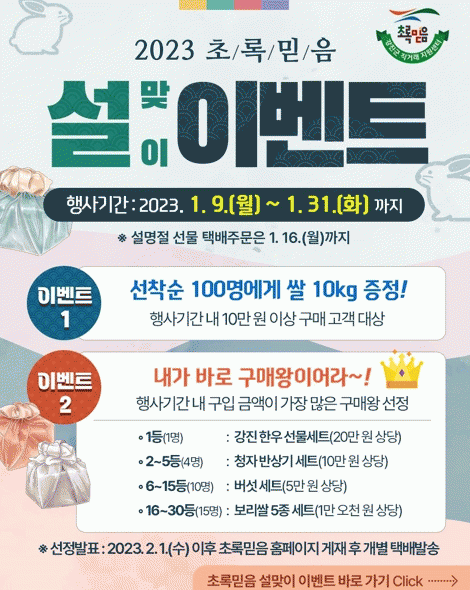 ¶Ç Çà»ç ±â°£ µ¿¾È ±¸ÀÔ ±Ý¾×ÀÌ °¡Àå ¸¹Àº °í°´ ÃÑ 30¸íÀ» ¼±Á¤ÇØ °Áø ³óƯ»ê¹°À» Ãß°¡·Î ÁõÁ¤ÇÏ´Â ¡®±¸¸Å¿Õ¡¯ À̺¥Æ®µµ ÁøÇà Áß¿¡ ÀÖ´Ù. 1µîÀº 20¸¸ ¿ø »ó´çÀÇ Çѿ켱¹°¼¼Æ®, 2~5µîÀº ûÀÚ ¹Ý»ó±â ¼¼Æ®(10¸¸ ¿ø »ó´ç), 6~15µîÀº ¹ö¼¸ ¼¼Æ®(5¸¸ ¿ø »ó´ç), 16~30µîÀº º¸¸®½Ò ¼¼Æ®(1¸¸5,000¿ø »ó´ç)¸¦ ÁõÁ¤ÇÑ´Ù.