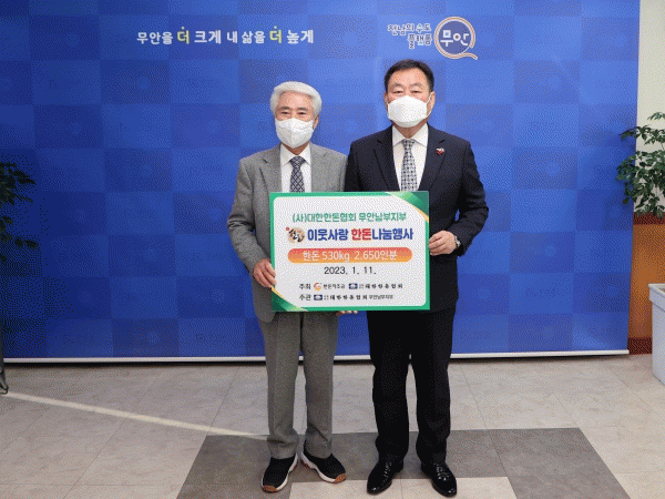 À̹ø Çà»ç´Â (»ç)´ëÇÑÇѵ·Çùȸ ¹«¾È³²ºÎÁöºÎ ȸ¿ø 20¿©¸íÀÌ Âü¿©ÇßÀ¸¸ç µ¶°Å³ëÀεé°ú ¼Ò¿Ü°èÃþÀÌ °Ç°ÇÑ °Ü¿ï³ª±â¿Í µû¶æÇÑ ¼³¸íÀý º¸³»±â¿¡ º¸ÅÆÀÌ µÇ°íÀÚ µÅÁö°í±â 440kg(530¸¸¿ø »ó´ç)À» ¹«¾È±º¿¡ Àü´ÞÇß´Ù.