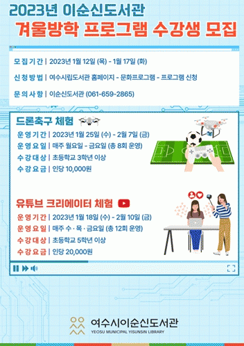 °³¼³ °Á´ ¡ãÃ౸ µå·ÐÀ» ÀÌ¿ëÇÑ ¡®µå·ÐÃ౸ üÇ衯(Ãʵî 3Çгâ ÀÌ»ó) ¡ã1ÀÎ ¹Ìµð¾î ¿µ»ó Á¦ÀÛ ¹× ÆíÁý üÇè ¡®À¯Æ©ºê Å©¸®¿¡ÀÌÅÍ Ã¢ÀÛ¼Ò¡¯(Ãʵî 5Çгâ ÀÌ»ó) 2°³ °ÁÂÀÌ´Ù.