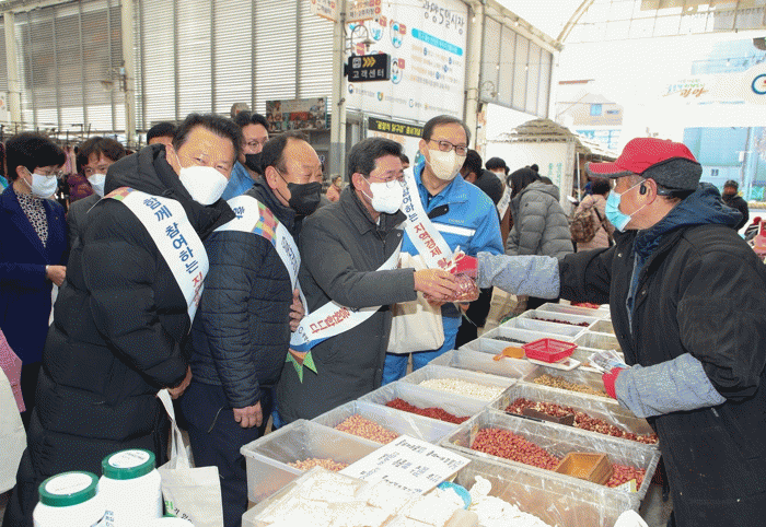 Á¤½ÃÀåÀº 1¿ù 16ÀÏ ±¤¾ç5ÀϽÃÀå°ú ±¤¾ç¸ÅÀϽÃÀåÀ» Â÷·Ê·Î ¹æ¹®ÇÏ¿©, ÁغñÇÑ ¿Â´©¸®»óǰ±ÇÀ¸·Î Á÷Á¢ Á¦¼ö¿ëǰÀ» ±¸ÀÔÇÏ°í »óÀεé°ú ´ëȸ¦ ³ª´©¸ç ¾î·Á¿òÀ» °Þ´Â ÀüÅë½ÃÀå »óÀεéÀ» °Ý·ÁÇß´Ù.