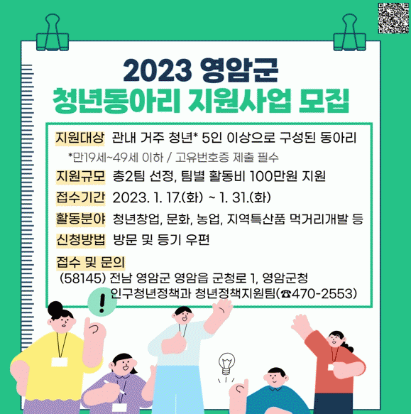 ¿µ¾Ï±º û³âµ¿¾Æ¸® Áö¿ø»ç¾÷Àº û³ââ¾÷, ¹®È, ³ó¾÷, Áö¿ªÆ¯»êǰ ¸Ô°Å¸®°³¹ß µî °øÅëµÈ °ü½É»ç¸¦ °¡Áø û³âµéÀÇ ´Ù¾çÇÑ ¸ðÀÓȰµ¿¿¡ ´ëÇØ ÆÀ´ç ÃÖ´ë 100¸¸¿øÀÇ È°µ¿ºñ¸¦ Áö¿øÇÏ´Â »ç¾÷À¸·Î, ½Åû´ë»óÀº ¿µ¾Ï±º¿¡ ÁÖ¼Ò¸¦ µÎ°í °ÅÁÖÇÏ´Â ¸¸ 19¼¼¿¡¼ 49¼¼ ÀÌÇÏÀÇ Ã»³â 5ÀÎ ÀÌ»óÀ¸·Î ±¸¼ºµÈ µ¿¾Æ¸®ÀÌ´Ù.