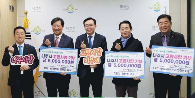 Àü¶ó³²µµ ³ªÁֽô 20ÀÏ ±èº¸°ï À籤³ªÁÖÇâ¿ìȸÀå, ÀÓ°æÁØ Áß¼Ò±â¾÷Áß¾Óȸ ±¤ÁÖÀü³²Áö¿ªÈ¸Àå, ÃÖ¼ø¹ü ±â¾÷ÀÎ(´ëÇ¥)ÀÌ °íÇâ»ç¶û±âºÎ±Ý ÃÖ°í¾×ÀÎ 500¸¸¿øÀ» °¢°¢ ±âŹÇß´Ù°í ¹àÇû´Ù.